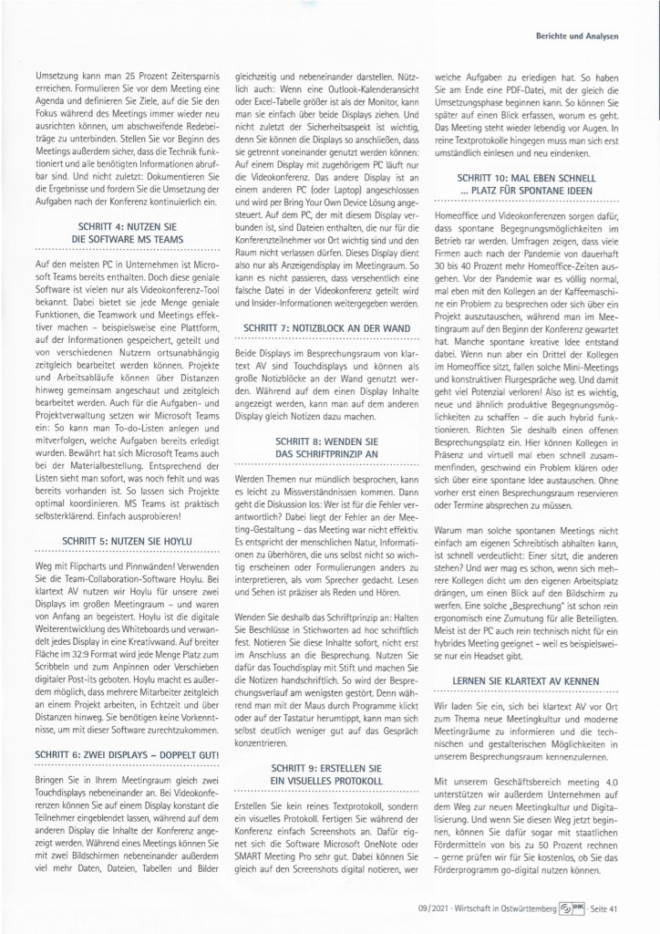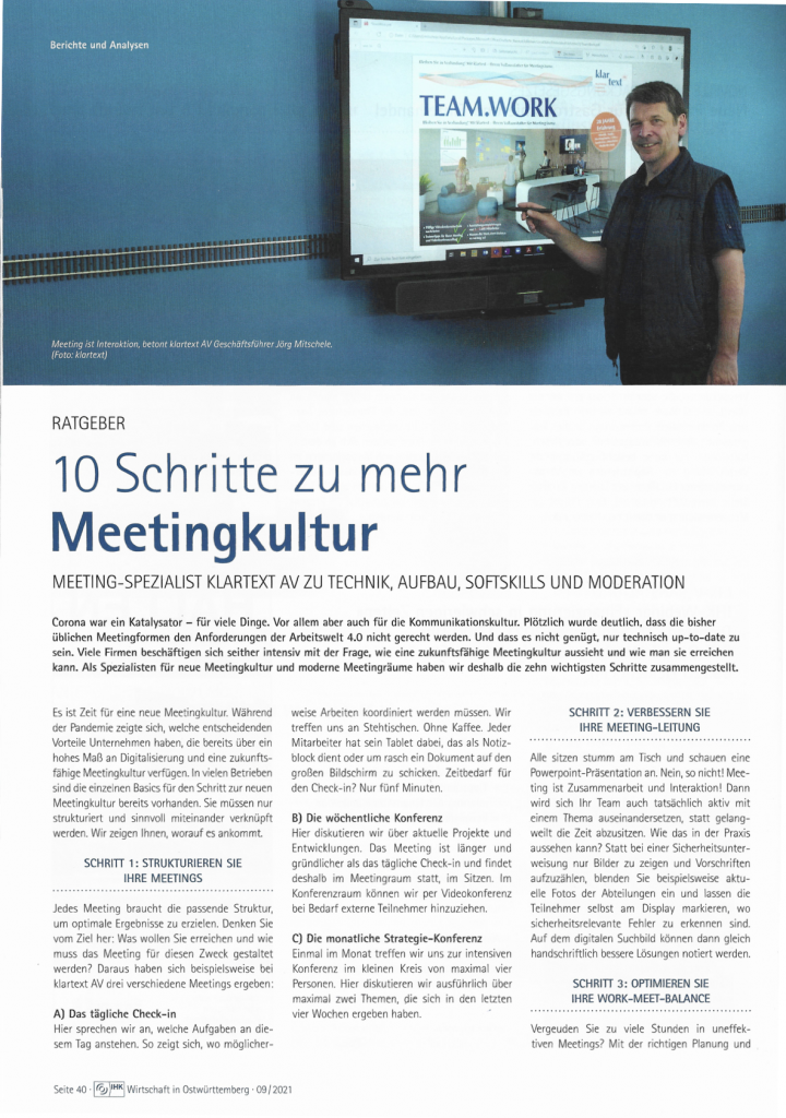 10 Schritte zu mehr Meetingkulturjo.mitschele | Veröffentlicht am 17. September 2021 | Meeting-Spezialist klartext AV zu Technik, Aufbau, Softskills und Moderation.Lesen Sie einen spannenden Artikel aus dem Wirtschaftsmagazin der IHK. Quelle: Wirtschaft in Ostwürttemberg, IHK Ostwürtttemberg, Ausgabe 09/2021, 8.September 2021 Beitragsnavigation ← Vorheriger BeitragNächster Beitrag →